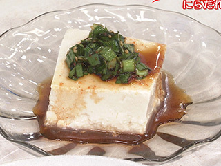材料・作り方(1人分) 絹ごし豆腐1/4丁(100g)に、にらだれ大さじ1/2をかける。