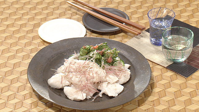 ささ身をゆでる直前に片栗粉をまぶし、ゆでたらすぐに氷水で冷やすのがポイント