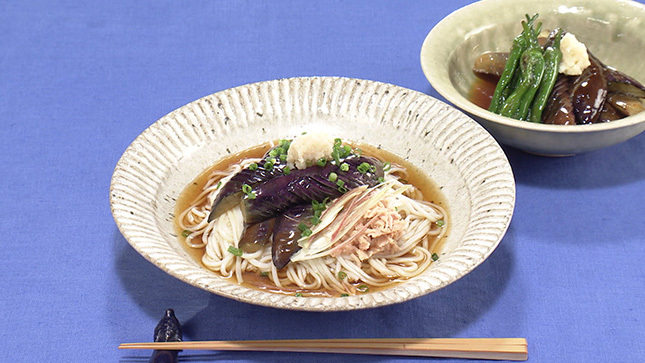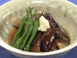 材料・作り方(2人分) なす2個(180g)は、上記の作り方(1)と同様にし、しし唐辛子6本(25g)はヘタの先を少し切り落とす。作り方(2)で、なすを焼いている途中でしし唐を加えて一緒に焼き、あとは作り方(3)まで同様に作る。器に盛り、おろししょうが適量をのせる。