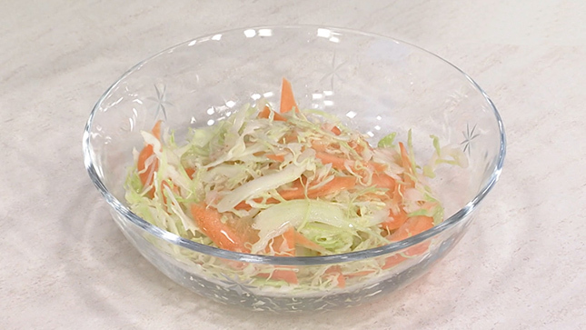 キャベツをスライサーでせん切りにするときは、芯がついたままスライスするとバラバラになりません