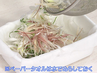 薬味野菜はせん切りにして、ぬらしたペーパータオルで包んでから保存容器に入れて、鮮度をキープ!