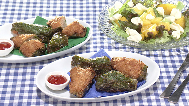 フライの衣をつけるのは、肉だねの面だけでOK(ピーマンの面につけても衣がはがれてしまうため)