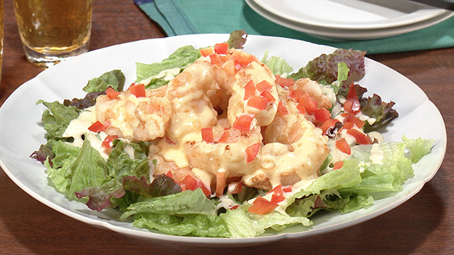 片栗粉と小麦粉を使い、卵なしの衣で揚げると、えびがサクサクとした口当たりになります