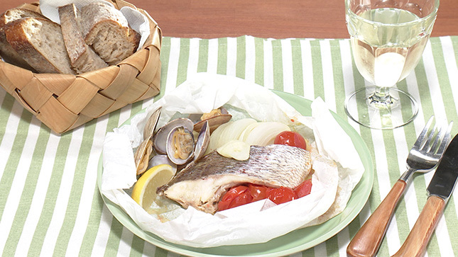 アクアパッツァは、魚介をオリーブ油でソテーし、白ワインなどで煮込んだイタリア料理です。これをオーブンペーパーに包んで電子レンジで作れば、鍋やフライパンなどの道具を使わないので、時短&洗いものの削減になります。