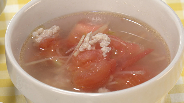 鶏ひき肉を水から煮ることでおいしいスープをとりましょう。トマトを加えたらさっと煮るだけでOK
