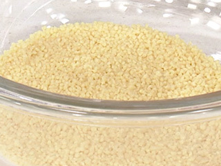 硬質小麦の一種、デュラム小麦を粒状に加工したもの。世界最小のパスタともいわれ、プチッとした食感が特徴。サラダのほか、煮込みやスープなどに混ぜて食べる。