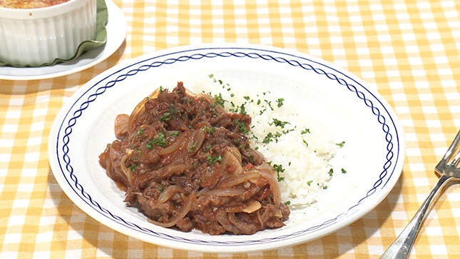切り落とし肉と薄切り玉ねぎを使うことで、短い時間で手軽に煮込み料理を作ることができます