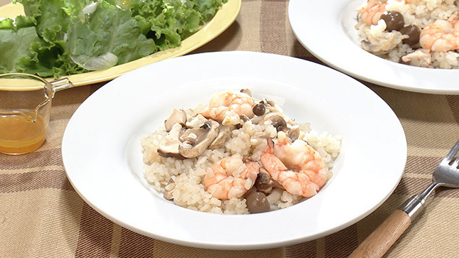 うまみの素になるえびと3種のきのこ。えびは食べやすいように殻をむき、きのこは3種を合わせて300g使用。