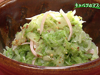 材料・作り方(2人分) ① キャベツの外葉2~3枚(200g)はせん切りにする。大きめの耐熱ボウルに入れて熱湯を注ぎ、ザルに上げて粗熱をとる。 ② ボウルにあらびきマスタード小さじ1、砂糖小さじ1/2、塩二つまみ、こしょう少々、酢、油各小さじ2を混ぜ合わせ、ハム2枚(20g)のせん切り、(1)のキャベツの水気を絞って加え、あえる。 キャベツの固い外葉は、捨ててしまいがちですが、熱湯をかけてしんなりさせると食べやすくなります。あえものにするのがおすすめ。