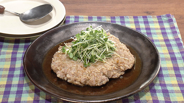 えのき茸は下から3㎝厚さの輪切りをステーキに、残りの上の部分を細かく切ってハンバーグに使いましょう