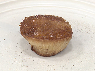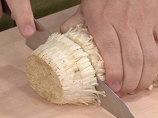 えのき茸は下から3㎝厚さの輪切りを作ってステーキに。残りの上の部分をハンバーグに使用する。