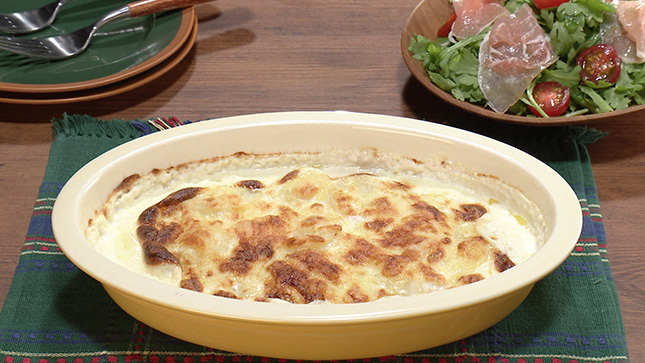 にんにくを加えるのがポイント。クリーミーなグラタンににんにくがいいアクセントになります