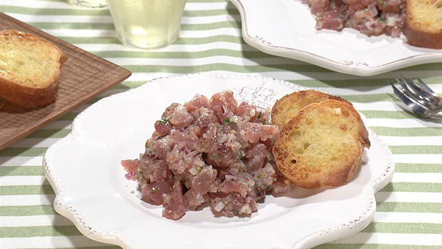 かつおはすべてたたかず、半量は角切りのままにすることで、食べごたえを残しましょう