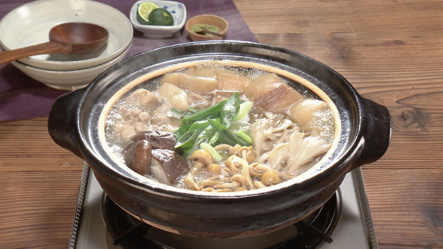 残った鍋つゆを煮立ててゆでうどんを入れ、やわらかくなるまで煮る。器に盛り、一味唐辛子少々をふる。好みですだちの輪切りを添えて。