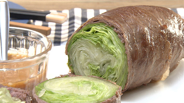 レタスをぎゅっと握るようにして筒状にまとめ、牛肉で包んで蒸し焼きにします