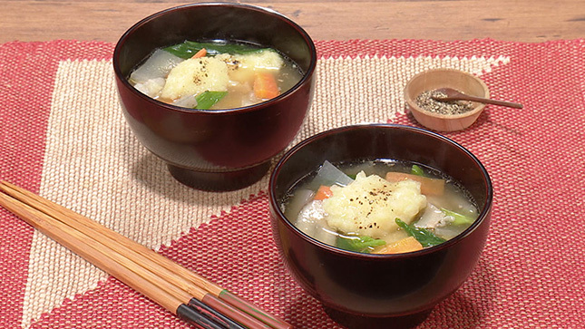 じゃが芋だんごを加えることで汁にもとろみがつき、体が温まります。粗びき黒こしょうをふって召し上がれ!