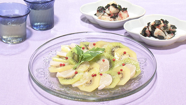 キーウィは緑と黄色のもの、2種類使うことで華やかな一皿に。ピンクペッパーを散らしてもきれいです