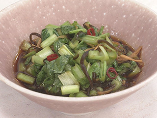 材料・作り方(作りやすい分量) ① 小松菜1/2わ(100g)は、1㎝幅に切る。 ② 塩昆布(細切り)5g、しょうがのせん切り1/2かけ分、赤唐辛子の小口切り1/2本分、しょうゆ大さじ1、砂糖小さじ1、ごま油大さじ1/2を混ぜ、(1)を加えて軽く混ぜる。しんなりとしたら食べられる。保存容器に入れ、冷蔵で4~5日保存可能。 小松菜はアクが少ないので漬けものにしてもおいしい葉野菜。余ったらみずみずしいうちに漬けておきます。ごはんのおともや、お弁当にも役立ちます。