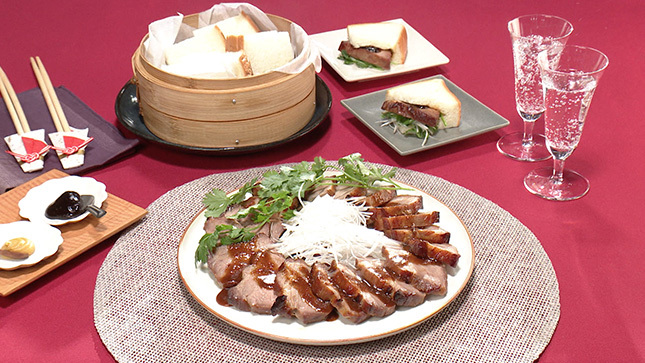 厚切りの食パンをセイロで蒸してふわふわに! 材料・作り方(4個分) 食パン(4枚切り)は4等分に切り、厚みの半分に切り込みを入れる。オーブンペーパーを敷いたセイロに並べる。蒸気の上がった鍋にセイロをのせ、ふたをして強火で2~3分蒸す。食パン1切れにチャーシュー1切れ、白髪ねぎ、パクチー各適量をはさみ、チャーシューに甜麺醤少々をぬる。