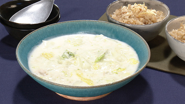 帆立と香味野菜を先に炒めてから白菜を煮ることで、白菜に帆立のうまみを吸わせます