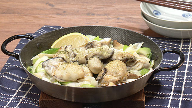 かきはさっと短時間で焼き、表面はカリッと、中はやわらかく仕上げるのがポイントです