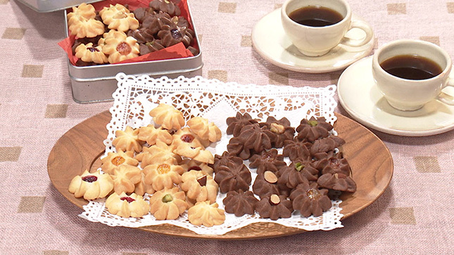 絞り出した生地の真ん中に好みのジャムやナッツをのせて焼きます。 ●ジャム 水でぬらした箸で軽く押してくぼみを作り、好みのジャムを入れる。 ●ナッツ 粗く刻んだナッツをのせる。