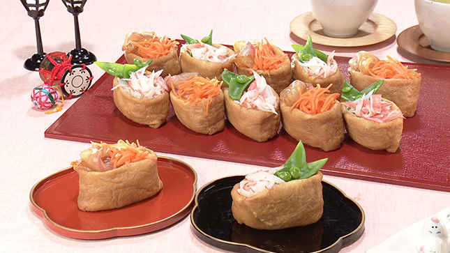 いなりずしの上に具材をのせることで、華やかな仕上がりに!ひな祭りにぴったりの一品になります