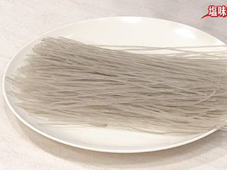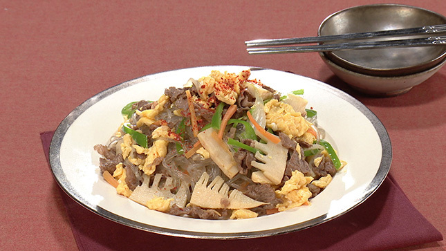 さつま芋でんぷんで作られる韓国産の春雨、タンミョン。緑豆でんぷんで作る中国の春雨より太く、もちっとした食感が特徴。韓国食材店やネット通販で購入できる。もどし方は商品によってゆで時間などが異なるので、表示を参考にして。
