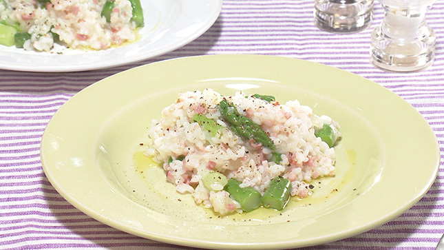 アスパラガスのゆで汁を使って米を炊き、香りを移すのがポイント