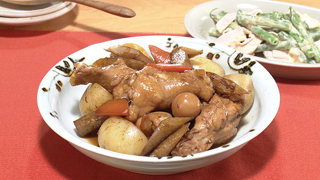 骨つきの鶏肉とウスターソースを使うことで、だし汁なしでもうまみたっぷりに煮上がります