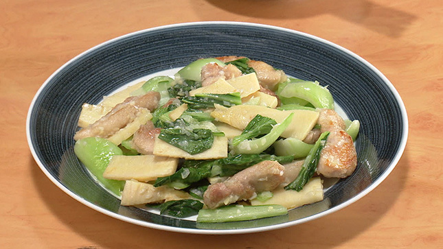 たけのこは焼き目がつく程度に炒め、チンゲンサイの葉先は最後に加えてさっと炒め合わせましょう