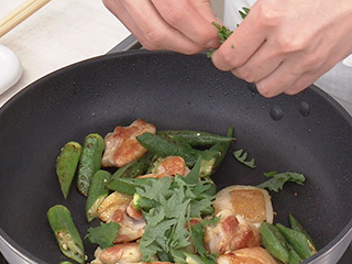 青じそはちぎって香りを立たせ、火を止めてから加える