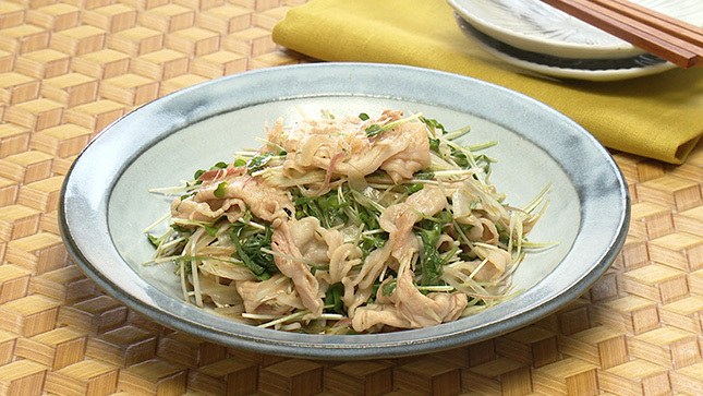 材料・作り方(1人分) ① 熱湯にそうめん1束(50g)を入れ、表示時間通りにゆで、流水で洗って氷水で冷やし、水気を絞る。 ② 器に盛り、塩一つまみ、ごま油小さじ1をかけ、ふんわり豚しゃぶの薬味あえ(上記参照)80gをのせる。ふんわり豚しゃぶの薬味あえの残ったたれ小さじ1をかけ、おろししょうが小さじ1/2をのせ、混ぜて食べる。
