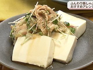 材料・作り方(1人分) 豆腐(好みのもの)1/2丁(150g)は横4等分に切り、器に盛って塩一つまみをふる。ふんわり豚しゃぶの薬味あえ(上記参照)80gをのせ、ふんわり豚しゃぶの薬味あえの残ったたれ少々もかけ、炒り白ごま少々をふる。
