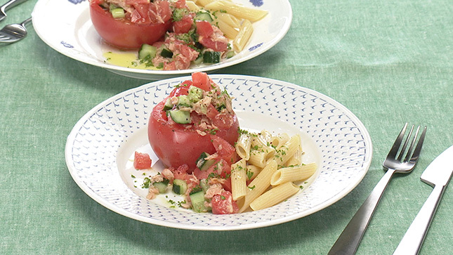 ペンネなどのショートパスタを添えて、トマトカップのサラダをくずしながら召し上がれ!