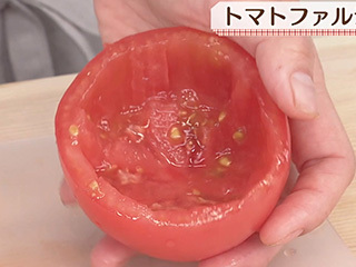 トマトの種と果肉をくりぬくときは、底の部分の果肉を少し厚めに残すと穴があきにくくなります