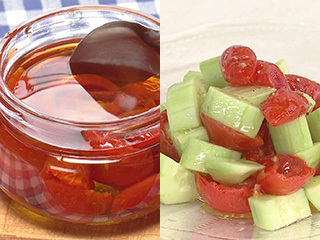 セミドライトマトはオリーブ油漬けにすれば保存も利きます。オイルごとパンにのせたり、パスタやスープ、ソテーした肉や魚、サラダに加えたり、いろいろな料理に応用できます。 ■セミドライトマトのオイル漬け 材料・作り方(作りやすい分量) 上記のセミドライトマト半量を保存容器に入れ、オリーブ油適量をかぶるまで注ぐ。冷蔵で約1か月保存可能。 セミドライトマトのオイル漬けを使って ■きゅうりのマリネ (91kcal/塩分1.1g) 材料・作り方(2人分) きゅうり1本(100g)はピーラーで皮をむき、1㎝厚さの半月切りにする。塩小さじ1/3、レモン汁小さじ1、セミドライトマトのオイル漬け(オイルごと)大さじ2を加えてあえる。器に盛り、粗びき黒こしょう少々をふる。