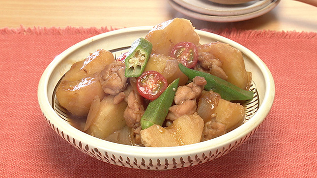 にんにくを加えることで、鶏もも肉のうまみと合わさって食べごたえのある肉じゃがになります