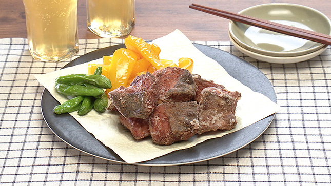 片栗粉は振り落とさず、しっかりとまぶして揚げることで、サクッと仕上げましょう