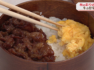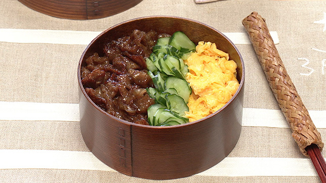 弁当箱にごはん180gを広げて詰め、牛の甘辛煮 → 炒り卵風 → きゅうりの浅漬けの順にのせる