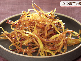 材料・作り方(作りやすい分量) ① さつま芋と皮のせん切りは、上記と同様に水にさらして水気をふく。フライパンに油大さじ5とともに入れて混ぜる。強めの中火にかけ、フツフツとしたら中火にしてときどき混ぜながら8~10分揚げ焼きにし、パリパリになり、所々きつね色になったら、とり出して油をきる。 ② フライパンの油をふきとり、水大さじ1、砂糖大さじ1+1/2、はちみつ大さじ1/2、塩少々を入れて火にかける。ときどき混ぜながら煮立て、表面の泡が細かくなってきたら弱火にし、(1)を戻し入れて手早くからめる。 ③ オーブンペーパーにとり出して広げ、くっついているところをざっとほぐして冷ます。 芋ようかんを作るときに、とりおいたせん切りのさつま芋と皮は、芋けんぴにするのがおすすめです。通常の芋けんぴは棒状のものを油で揚げますが、せん切りなので、少ない油で揚げ焼きにすればOK。食感もよく、あと引くおいしさです。
