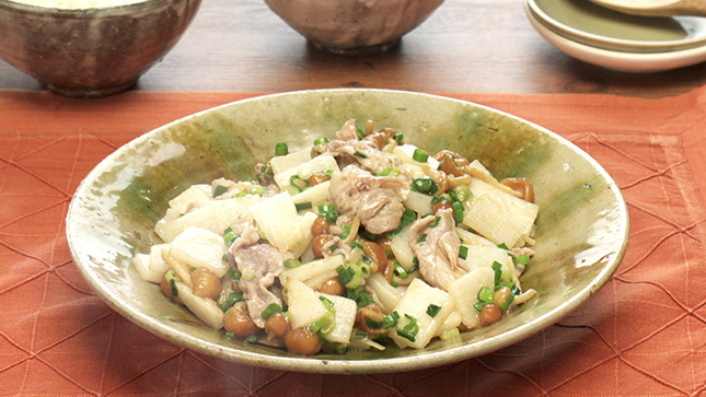 みそ汁やあえものに使うことが多いなめこを炒めもので味わいます。長芋との食感の違いを楽しんで