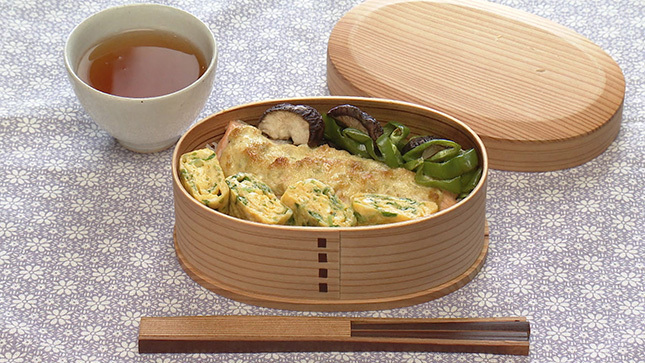 弁当箱にごはん180gを広げて詰め、鮭の柚子こしょうマヨ焼き → 豆苗入り卵焼き → 椎茸とピーマンの塩焼きの順にのせる