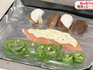 オーブントースターの天板に鮭と椎茸、ピーマンをのせて一緒に焼く。