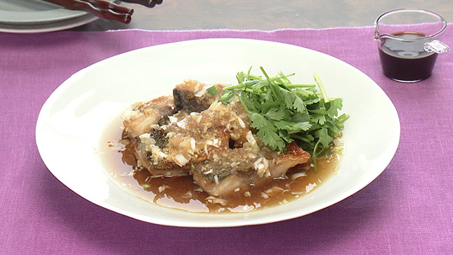 さばは片栗粉をまぶしてから揚げ焼きにし、全面に焼き色をつけることで香ばしさをプラスしましょう