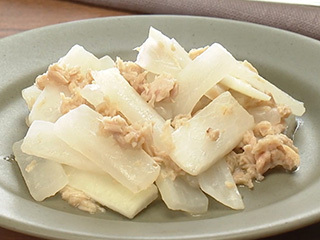 材料・作り方(作りやすい分量) ① 大根400gは皮つきのまま3~4㎝長さ、1.5㎝幅に切る。にんにく1/2かけは薄切りにする。 ② (1)を鍋に入れ、ライトツナ(フレーク)〈サラダクラブ〉1袋(80g)は汁ごと、ローリエ1枚、オリーブ油大さじ1、塩小さじ1/2を加えて火にかけ、煮立ってから10分ほど煮る。冷めたら保存容器に入れ、冷蔵で4~5日保存可能。 「大根と豚こまの甘辛煮」の残りの大根は、みずみずしいうちに調理して、おいしく食べきります。シンプルな塩煮は合わせやすく、副菜に重宝します。