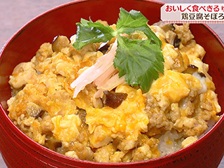 卵でとじるだけ。卵があれば パパッとできて忙しい日のお助けに。 材料・作り方(2人分) ① 卵2個は溶きほぐす。 ② フライパンに「鶏豆腐そぼろ」(上記参照)全量、しょうゆ小さじ1を入れて温め、(1)をまわし入れる。ざっくりと混ぜ、ふたをして1〜2分煮る。 ③ 器にごはん(温かいもの)300gを盛り、(2)をのせる。好みで三つ葉、紅しょうが各少々を添える。