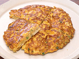 卵に混ぜて焼くだけで主菜のでき上がり。 青みはピーマンやさやいんげんでも。 材料・作り方(2人分) ① ボウルに卵3個を溶きほぐし、「鶏豆腐そぼろ」(上記参照)100g、しょうゆ小さじ1、万能ねぎ2~3本(10g)を小口切りにして加えて混ぜる。 ② 小さめのフライパンに油大さじ1/2を熱し、(1)を流し入れる。大きく混ぜて平らに広げて2分ほど弱めの中火で焼く。焼き色がついたら平らな皿に滑らせるようにして移し、フライパンをかぶせて返し、さらに1分ほど焼く。 ③ 食べやすく切り分けて器に盛る。