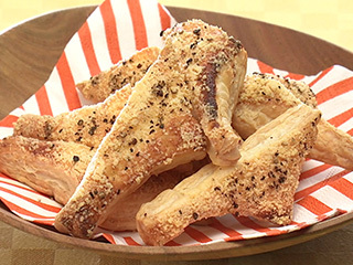 材料・作り方(作りやすい分量) ① パイシートの切り落とし全量は8等分に切る。1枚ずつはがし、溶き卵がついた面に粉チーズ大さじ2~2+1/2をつけ、オーブンペーパーを敷いた天板に粉チーズの面を上にして間隔をあけて並べ、粗びき黒こしょう少々をふる。 ② 200℃に予熱したオーブンで15分焼く。 ガレット・デ・ロワで切り落としたパイ生地は、粉チーズと粗びき黒こしょうをふってオーブンで焼けば、おやつやワインに合うおつまみになります。