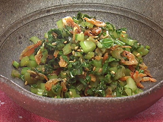 材料・作り方(作りやすい分量) ① かぶの葉(約50g)は小口切りにする。 ② フライパンにごま油大さじ1/2、桜えび(乾燥)3gを入れ、火にかけて炒める。桜えびがチリチリとしてきたら、(1)を加えてしんなりとするまで炒める。しょうゆ、炒り白ごま各小さじ1を加えて炒める。 残りのかぶの葉は鮮度がよいうちに、桜えびとごま油で炒めて副菜に。香ばしくてごはんがすすみます。ビタミンなどの栄養を含むかぶの葉をおいしく食べられます。